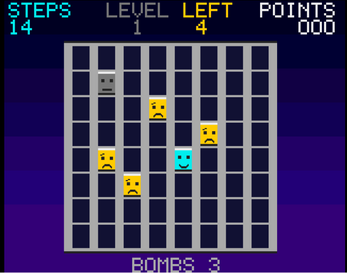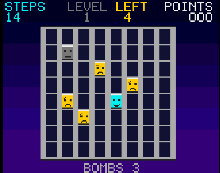 - Watch out: When you move, ALL angry smileys slide in the same direction until they hit a wall or neutral smiley.